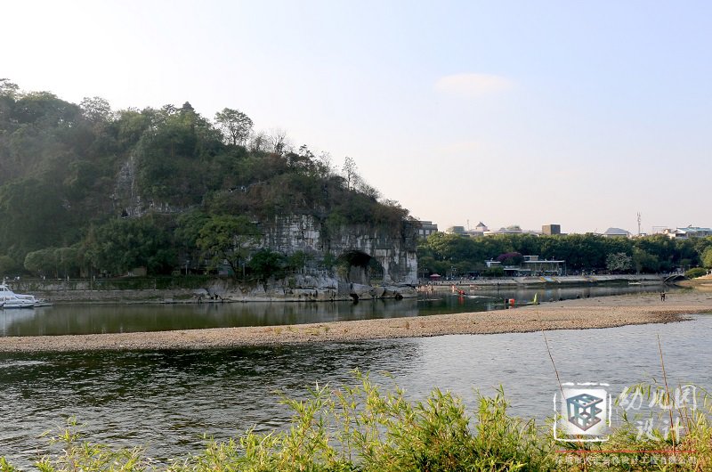 象山是桂林城市的城徽和標(biāo)志,它因?yàn)樾螤钕褚恢辉诮吷毂菚筹嬂旖木尴蠖妹?,其次,在鼻腿之間造就一輪鄰水明月,構(gòu)成“象山水月”奇景。