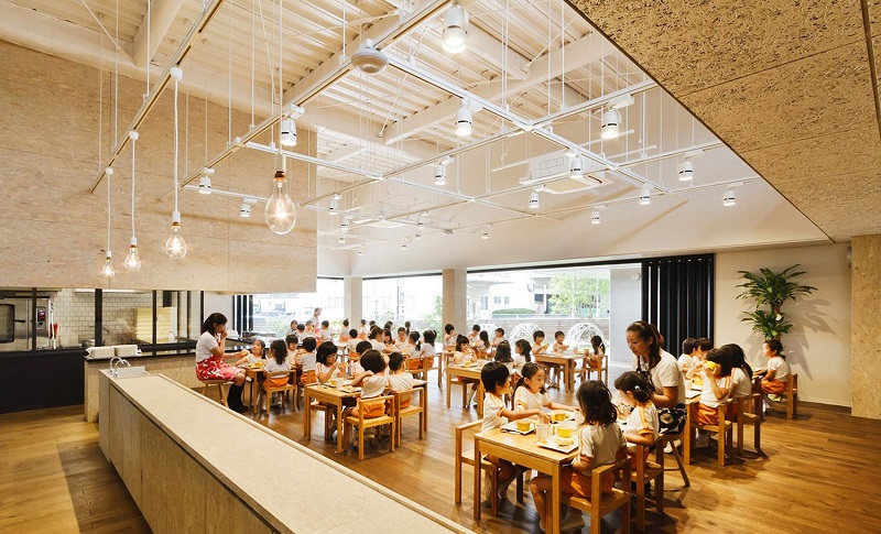 園所餐廳與廚房連在一起,用玻璃分隔了兩個(gè)空間,托兒所內(nèi)的孩子們可以在餐廳清楚的看到進(jìn)入他們口中食物誕生的過程,食物是怎么誕生的,這是日本食育中的重要一部分。
