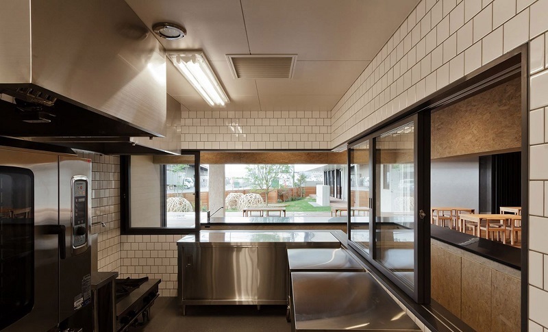 即便是處在廚房,廚房的工作人員也可以看到戶外的小花園,為他們提供了一個(gè)良好的工作環(huán)境,體現(xiàn)幼兒園對(duì)園所內(nèi)員工的一種重視。