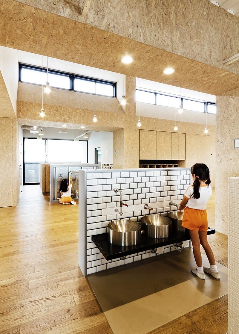托兒所使用了大量的歐松板作為墻體、做櫥柜或是園所內(nèi)的柱子,歐松板獨(dú)特的紋理給園所帶來一種粗糲的美感,與園所外圍的工業(yè)風(fēng)也能相協(xié)調(diào),歐松板的顏色和地面的實(shí)木地板相近色的搭配,視覺上的感受能更舒適,此外歐松板由于內(nèi)部結(jié)構(gòu)極其穩(wěn)定,制成的房屋還具有不沉降、抗老化和抗震性,對(duì)于日本這個(gè)處于地震帶的區(qū)域而言,公共建筑具有高等級(jí)的抗震性是十分必要的。
