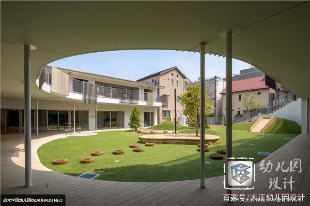 幼兒園中庭是一個(gè)翠綠的戶(hù)外活動(dòng)場(chǎng)地,人工構(gòu)建的草坡,圍繞樹(shù)“生長(zhǎng)”的木制平臺(tái),陷入草地的“樹(shù)樁”,都成為兒童快樂(lè)的所在。通過(guò)圍墻附近的階梯,從中庭可以直接上到建筑的二樓。