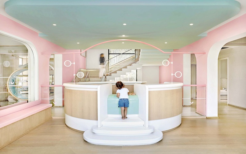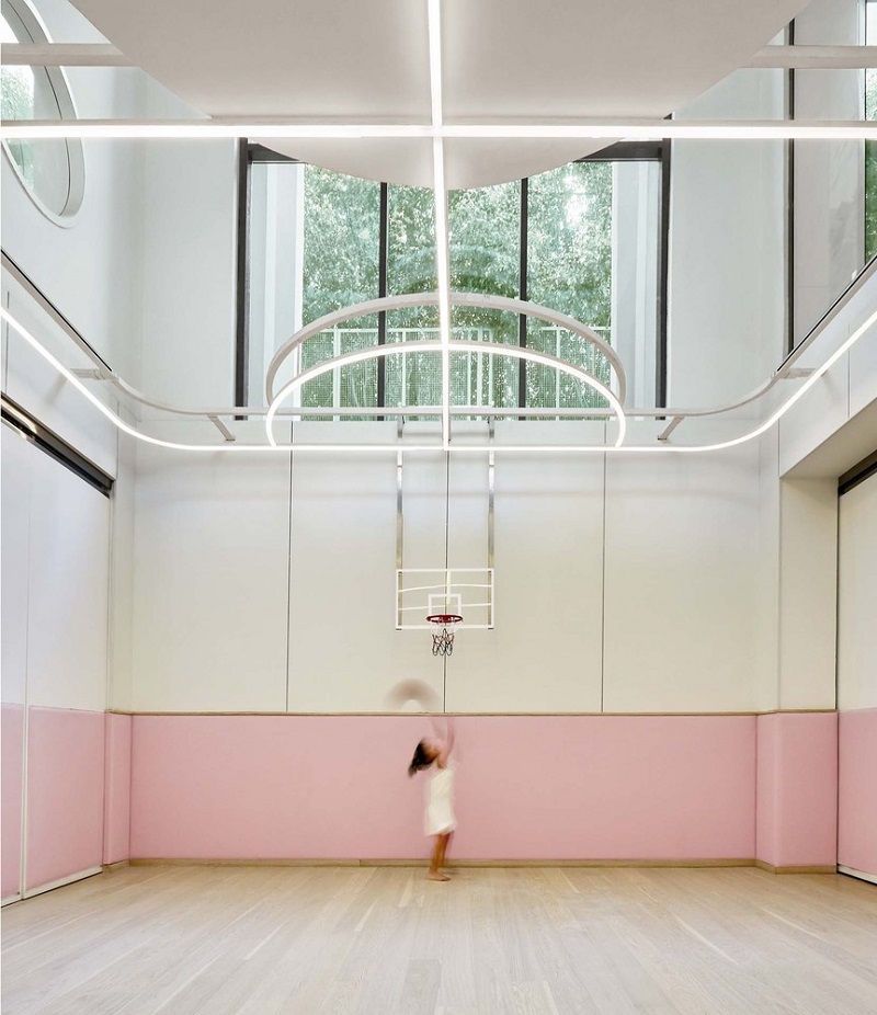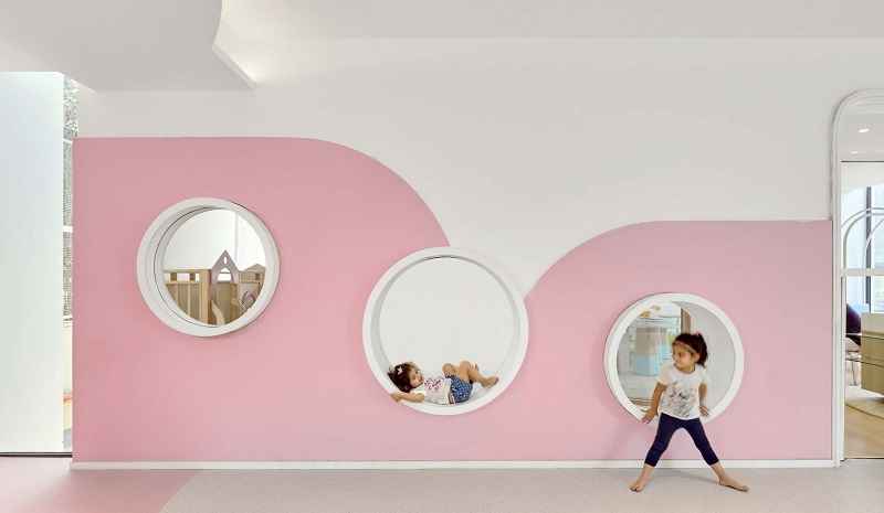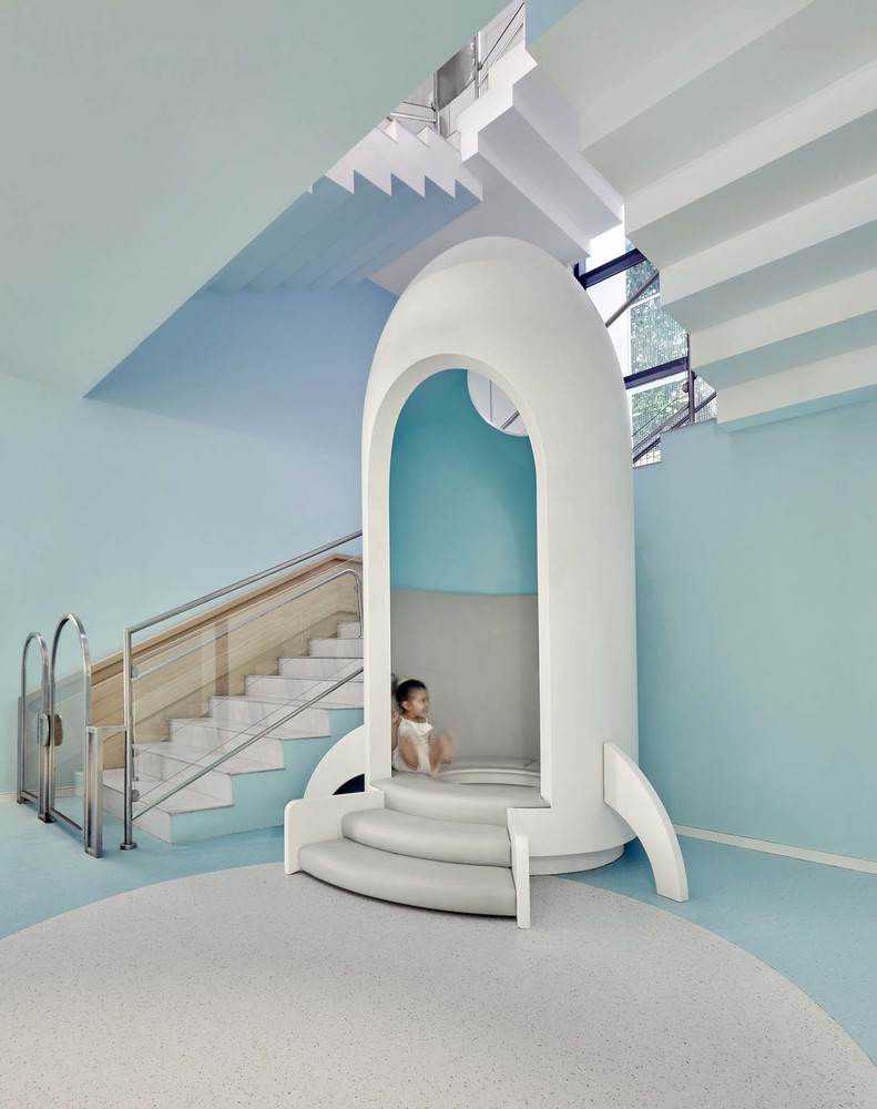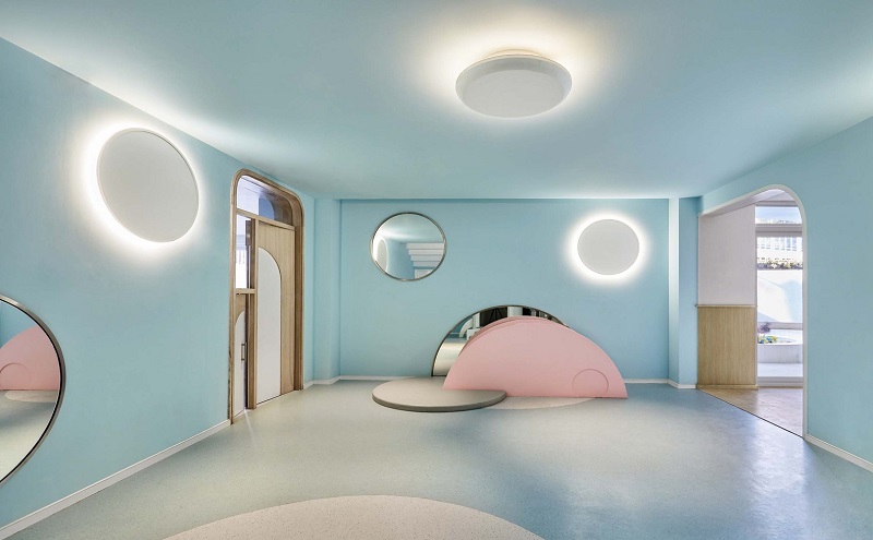 項目室內(nèi)的用開放的姿態(tài)將戶外自然的景致引入室內(nèi),溫柔的粉色和藍色配合使視覺感受更豐富,自然光線洋溢在室內(nèi),并引至地下層,令孩子們可以充分發(fā)揮。