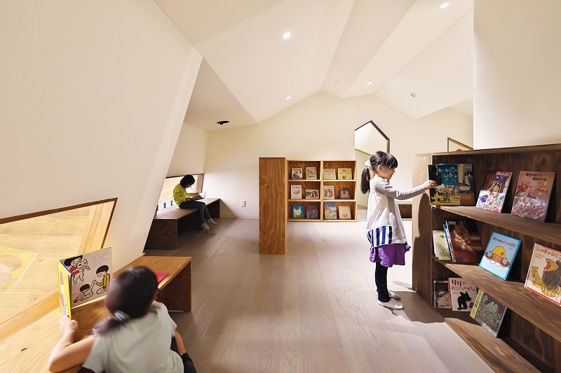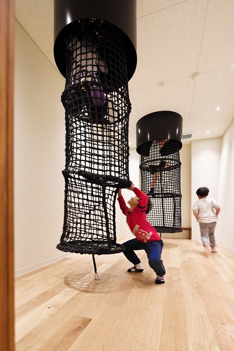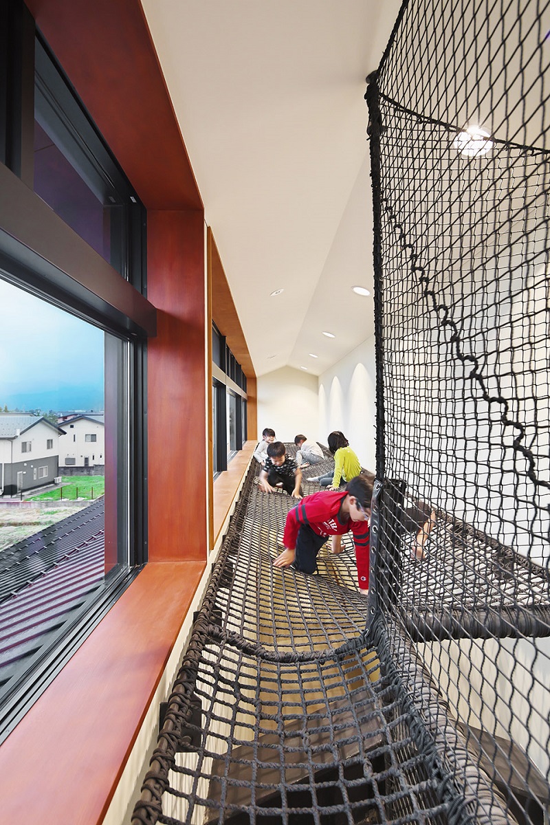建筑師以立山連峰等環(huán)境要素作為園舍的設(shè)計靈感,在園所室內(nèi)設(shè)置了十幾處游戲場所,刺激著孩子們的好奇心,這些游戲場所包括凹凸不平像巖洞一樣的迷你空間,使人想要不斷前行探索的隧道一般的走廊,模擬瀑布的網(wǎng)狀攀登游戲道具,能俯視一樓廚房和餐廳的“眺望之丘”,被繪本圍繞能讓人安心閱讀的繪本池等。