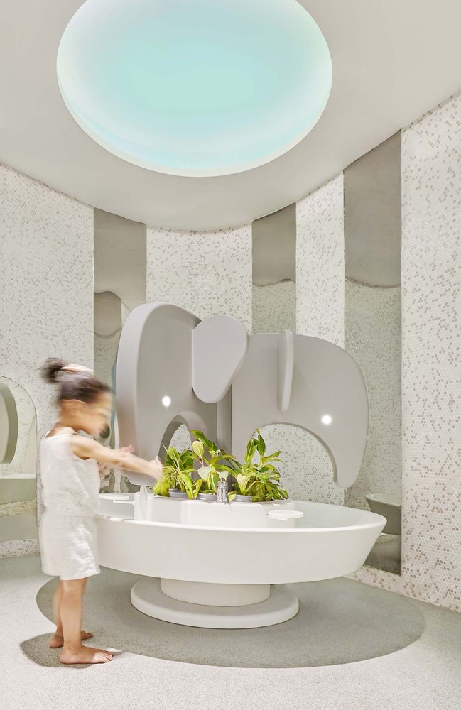 室內(nèi)的門采用不規(guī)則設(shè)計一側(cè)大,一側(cè)小,讓孩子們能夠擁有自己的那一扇門,洗手池的大象也是設(shè)計師的小巧思,吸引著孩子們洗手,從小養(yǎng)成良好的衛(wèi)生習(xí)慣。